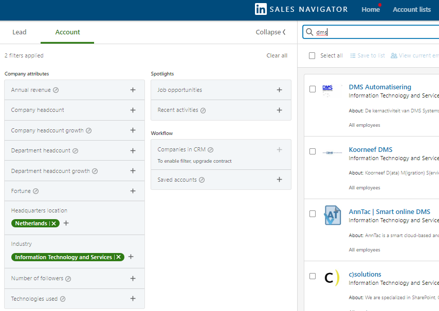 LinkedIn SalesNavigator can be used to find the competition. Filter by region and the industry “Information Technology and Service” and add a relevant keyword like DMS (Document Management System)